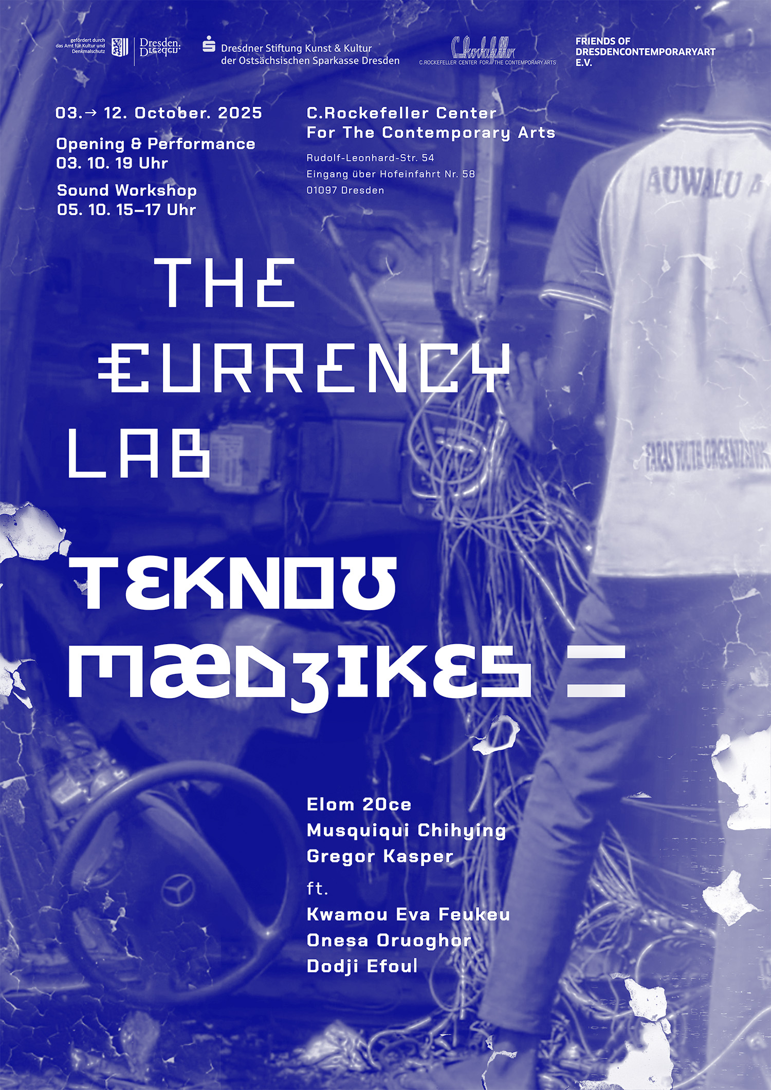 THE CURRENCY LAB – tɛknoʊmædʒɪkɛs ist ein Ausstellungsprojekt von Elom 20ce (Togo), Musquiqui Chihying (Taiwan) und Gregor Kasper (Deutschland) im E-Werk Freiburg im Mai/Juni 2025, zu dem sie als Ergänzung ihrer kollektiven und kollaborativen Praxis weitere Künstler:innen, Musiker:innen und Wissenschaftler:innen eingeladenen haben, mit denen sie alle bereits zusammenarbeiten und im Austausch stehen.